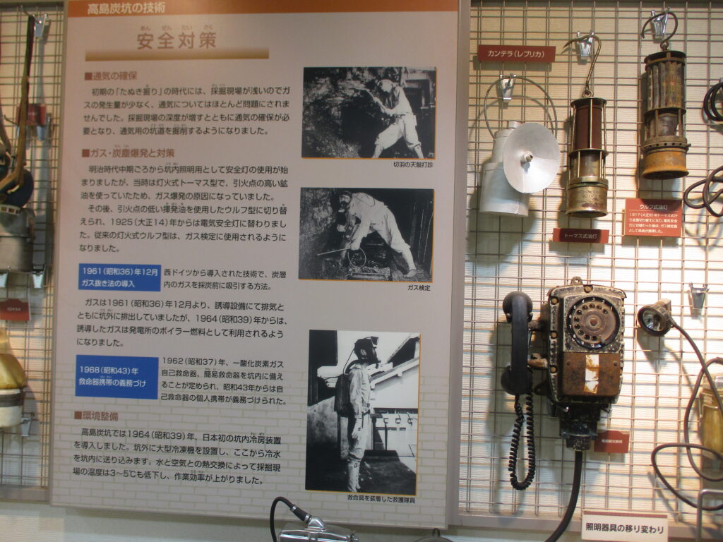軍艦島や池島にはこうした資料館が無いので、離島の炭鉱を知るという点で、貴重な施設と言えるかもしれません。施設自体はそれほど大きくありませんが、往時の高島の写真や、炭鉱で使用されていた機具・道具、各種資料が展示されています。
