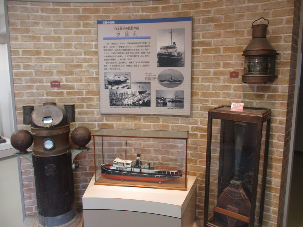 こちらは、1962年までの74年間、長崎―高島―端島間を運航し、人や石炭を運んでいた「夕顔丸」の模型です。当時の最先端技術を投入して建造された日本で最初の鉄製汽船で、1887年に長崎造船所で4番目の船として進水したと紹介されています。