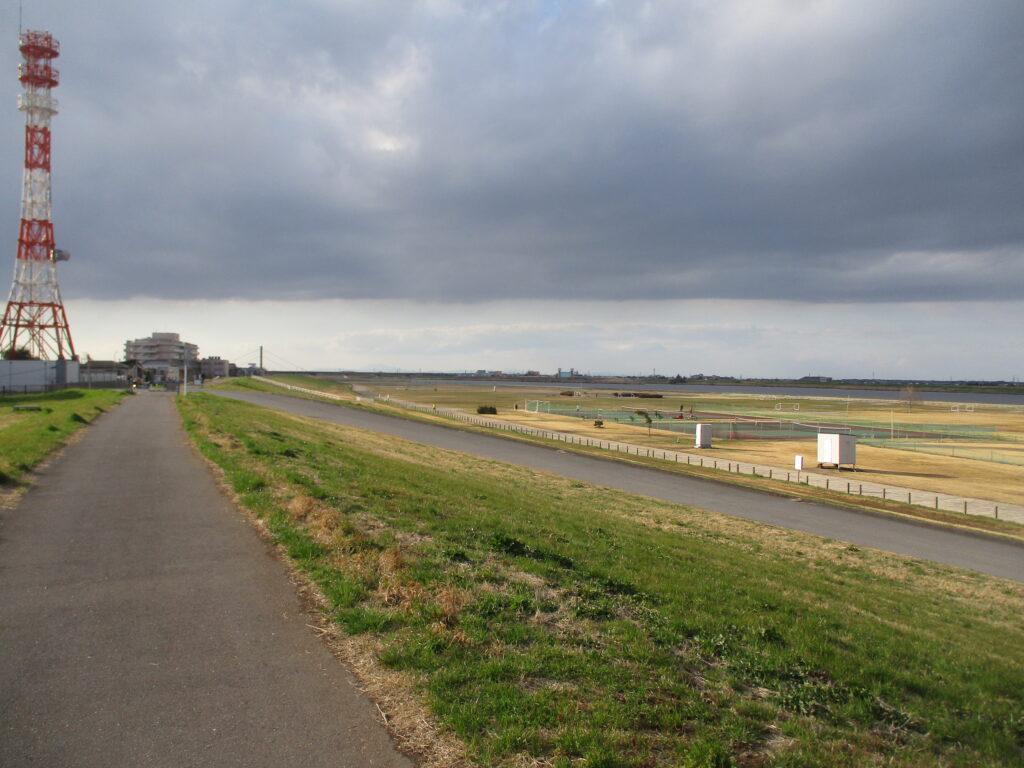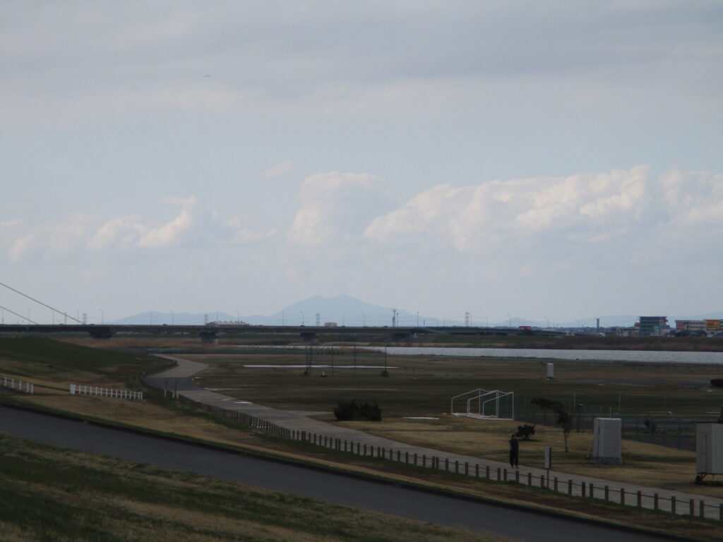 遠くに筑波山がうっすらと見えています。なお、利根川は古くからこの場所を流れていたわけではありません。1590年に徳川家康が江戸へ入った当時、利根川と荒川は埼玉県の越谷付近で合流し、東京湾へ注いでいました。