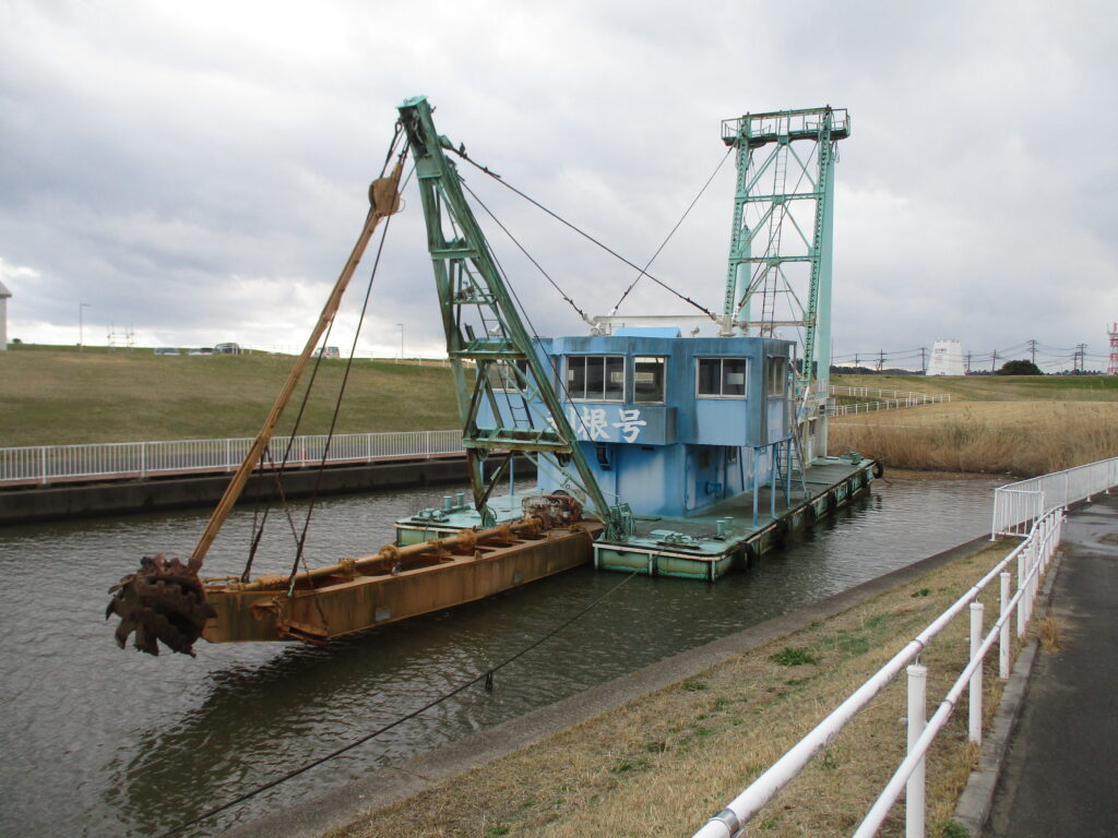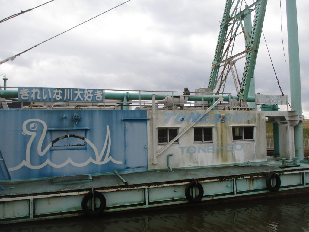 浚渫船「利根号」が停泊していました。浚渫とは、川底などに堆積した土砂を取り除く作業のこと。川を深くすることで、大雨で水量が増えても水位の上昇を抑え、堤防越水の危険を軽減することが出来ます。