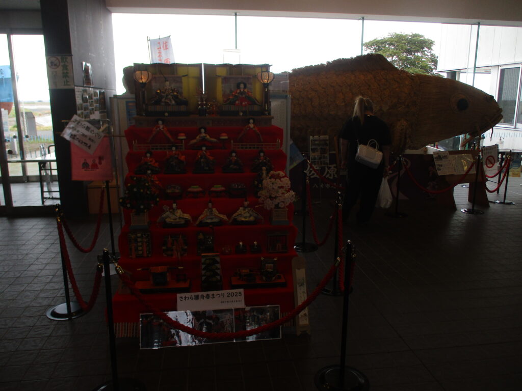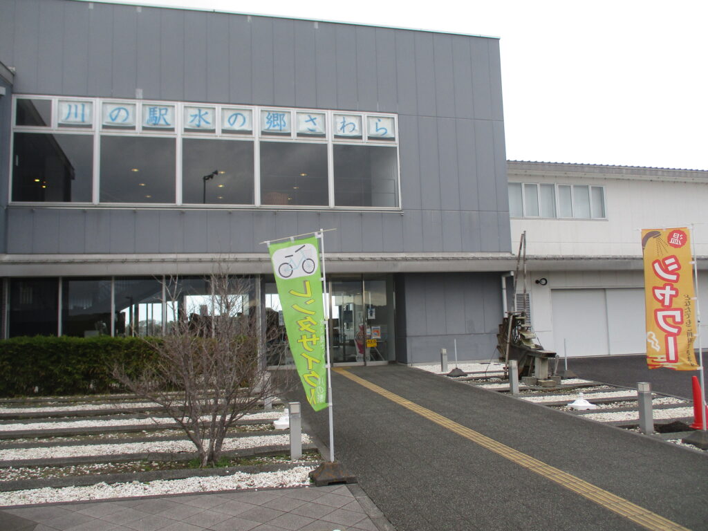 水の郷さわらに到着。2010年に完成した全国初となる「道の駅」と「川の駅」が一体化した複合施設で、災害復旧に必要な資材を備蓄する河川防災ステーションを併設した防災拠点となっています。