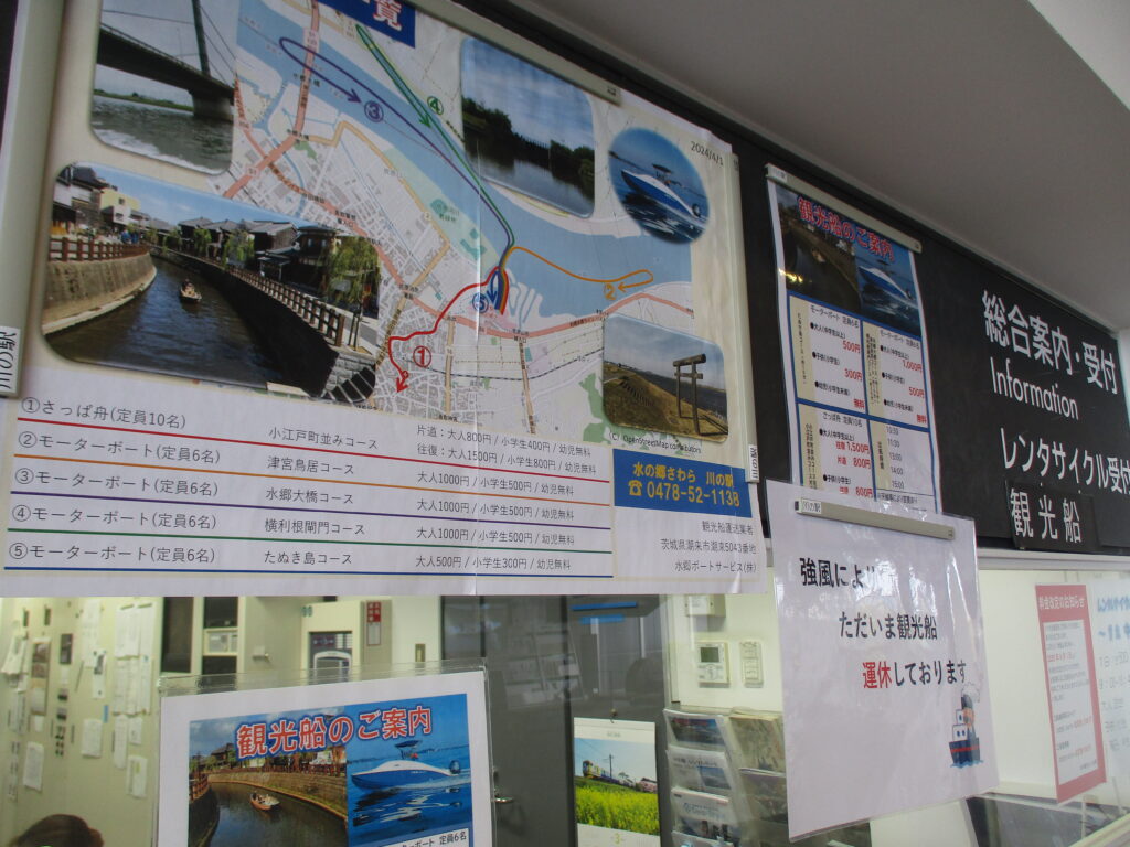まずは川の駅から。小野川の遊覧船(さっぱ舟)だけでなく、利根川でのモーターボートや、水路でのカヌーもありますが、この日は強風で運休となっていました。