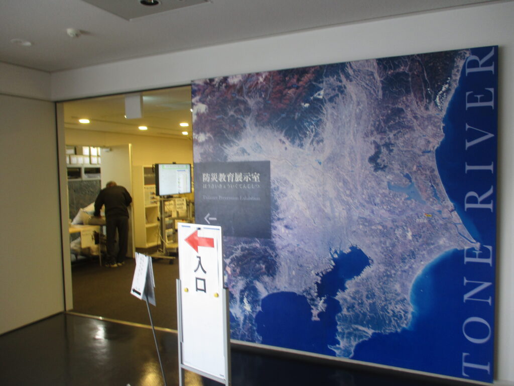こちらは防災教育展示室。見学は無料です。利根川の特徴や過去の水害の記録、防災に必要な知識について、パネル展示や映像、模型資料などを通じて学ぶことができます。
