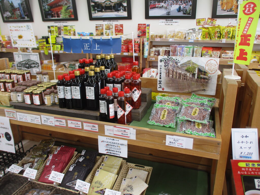 こちらは小野川沿いにあった醤油屋さん「正上」の棚。お土産の種類も豊富です。