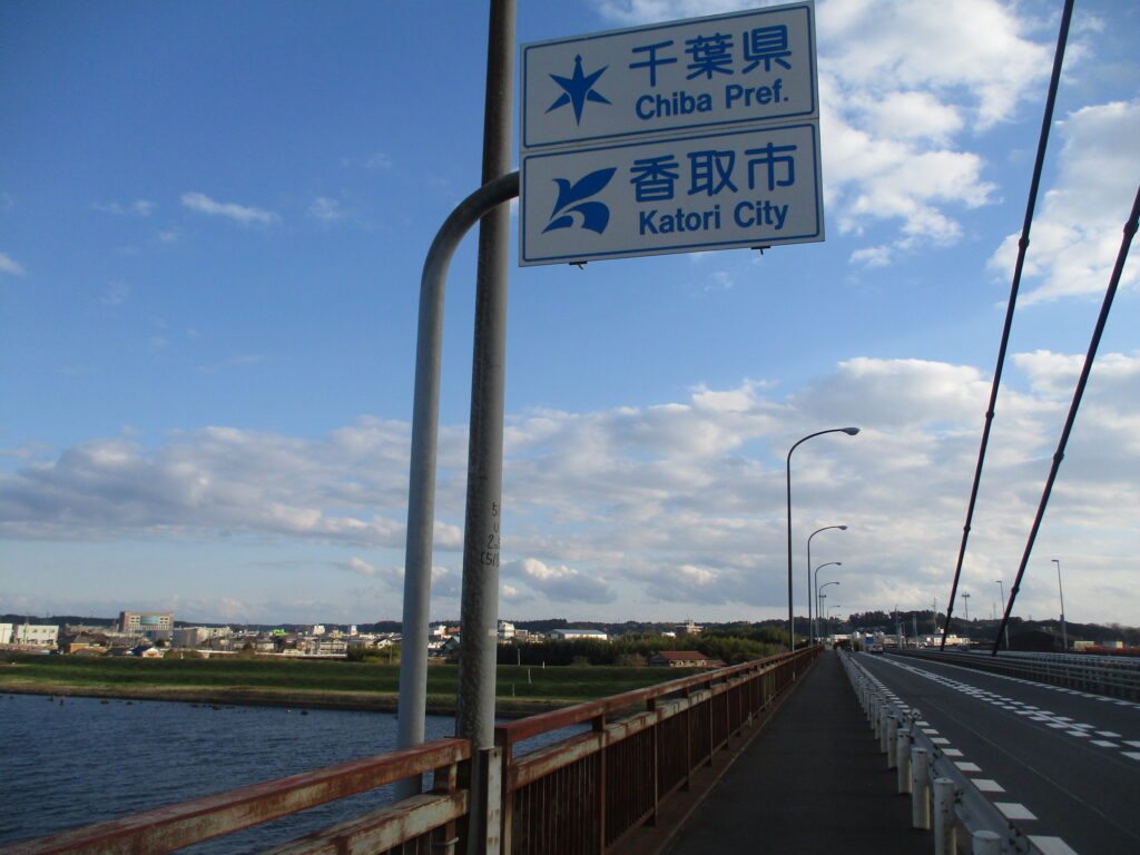 ということで、利根川で隔たれた千葉県と茨城県を結ぶ水郷大橋に到着。この橋は千葉市と水戸市を結ぶ国道51号線の一部となっています。