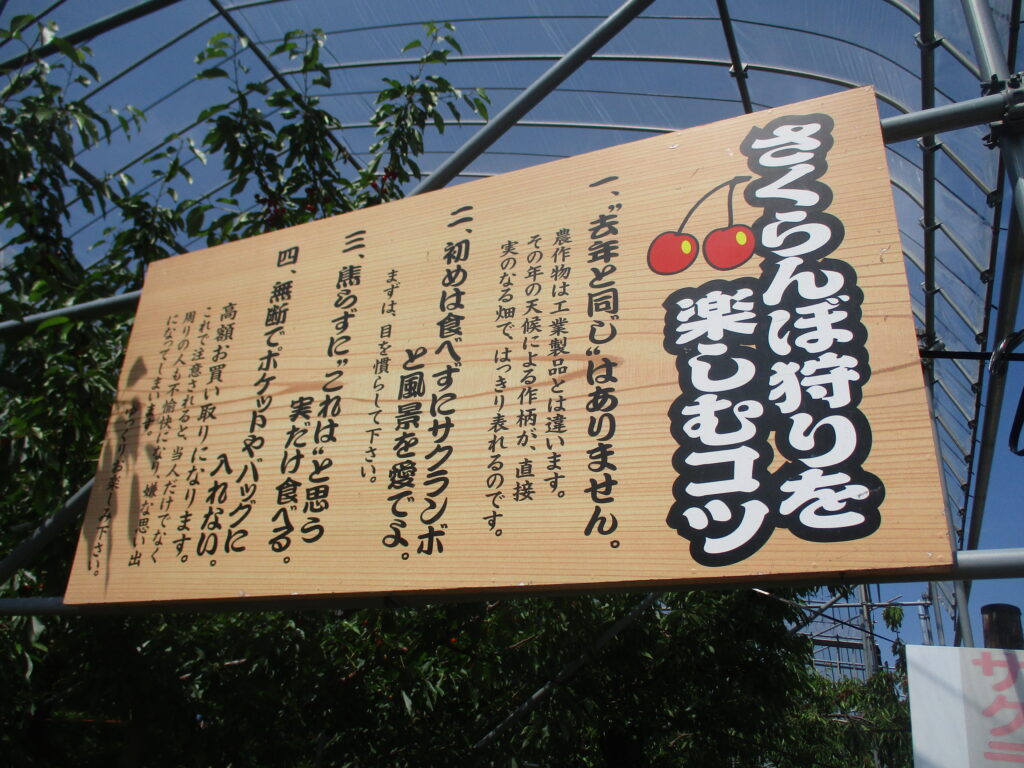 『さくらんぼ狩りを楽しむコツ』が書かれた看板がありました。ここでは4つのコツが紹介されています。