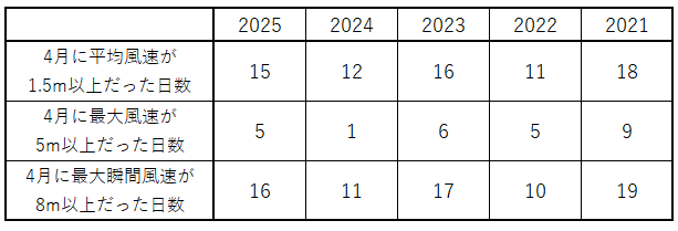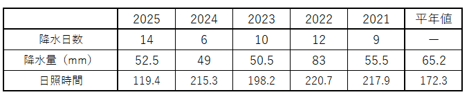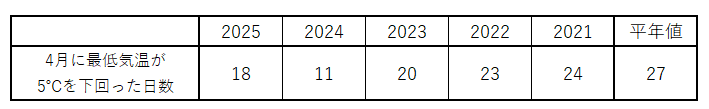 今一度、村山市における5年分(2021年~2025年)の気象データを確認してみます。まずは気温から。2025年4月の平均気温は平年値よりも高いので、『最低気温が5℃を下回った日数』を知らべてみましたが、やはり「気温の低い日が続いた」というわけではなさそうです。