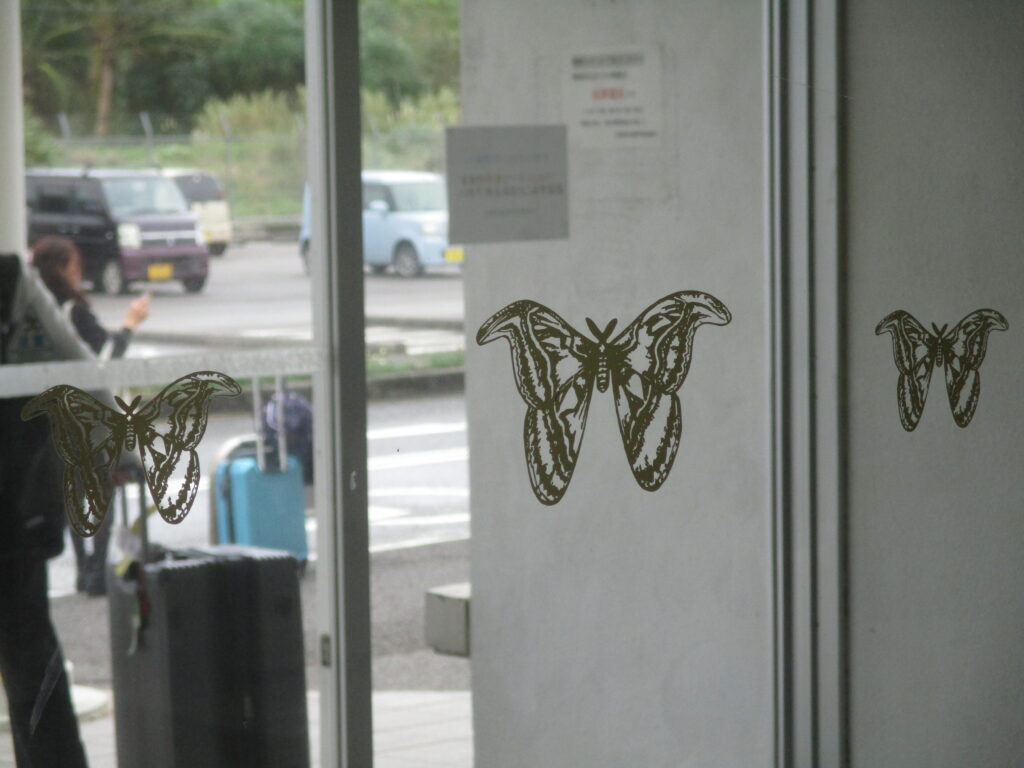 窓に大きな蝶が描かれているのを発見しました。こちらは蝶ではなく、「ヨナグニサン」という世界最大の蛾。インドから東南アジア、中国、台湾にも生息しているそうですが、日本では与那国島で初めて採集されたことから、この名で親しまれています。
