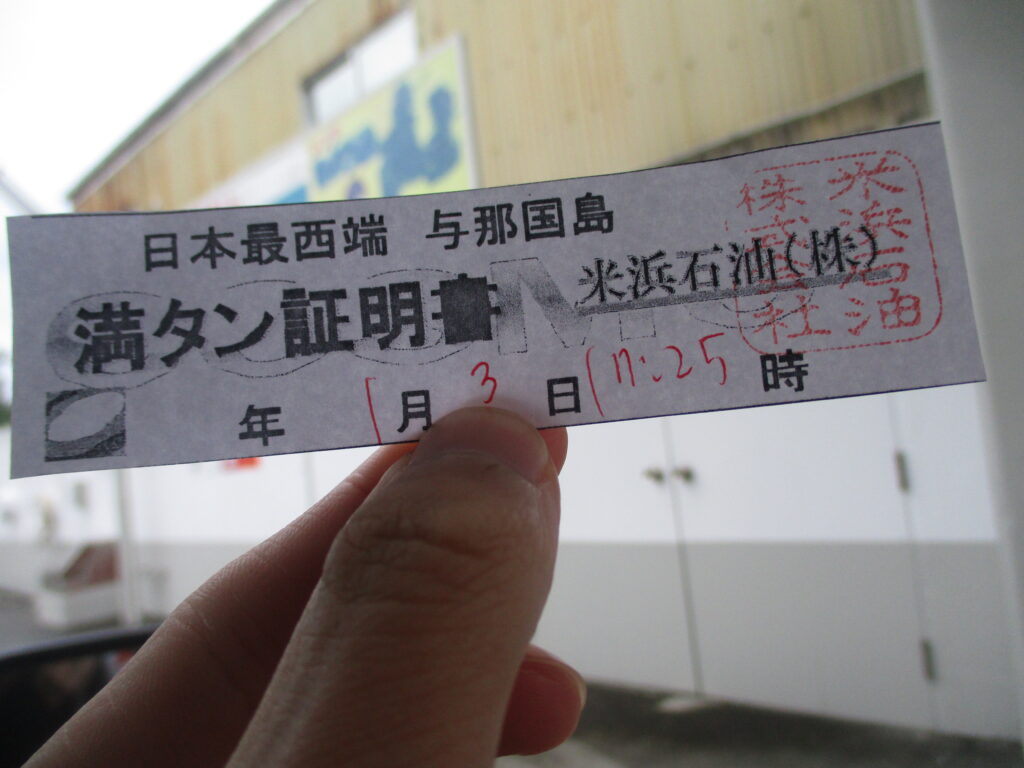 満タン証明書もゲットし、時間通りに車を返却。短い時間でしたが、与那国島を観光することが出来たので良かったです。