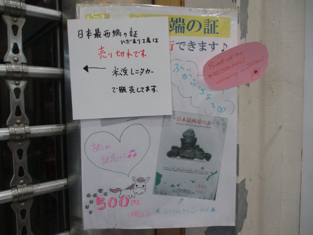 こちらのお店では『日本最西端の証』が売り切れているとのこと。一方で、米浜レンタカーで販売しているという案内が書かれています。